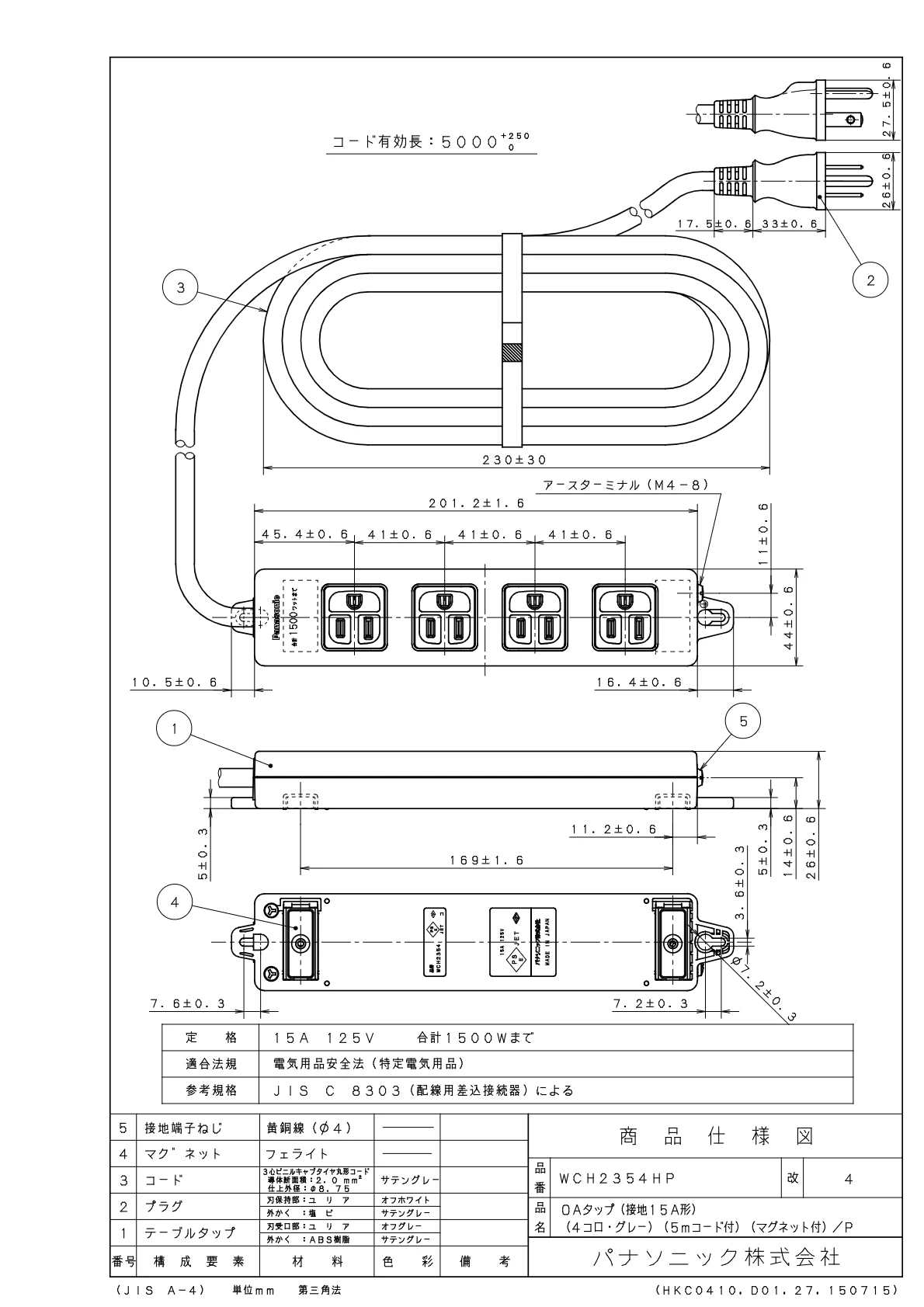 品番:WCH2354HP品名:OAタップ(接地15A形)(4コ口・グレー)(5Mコード付)(マグネット付)/P