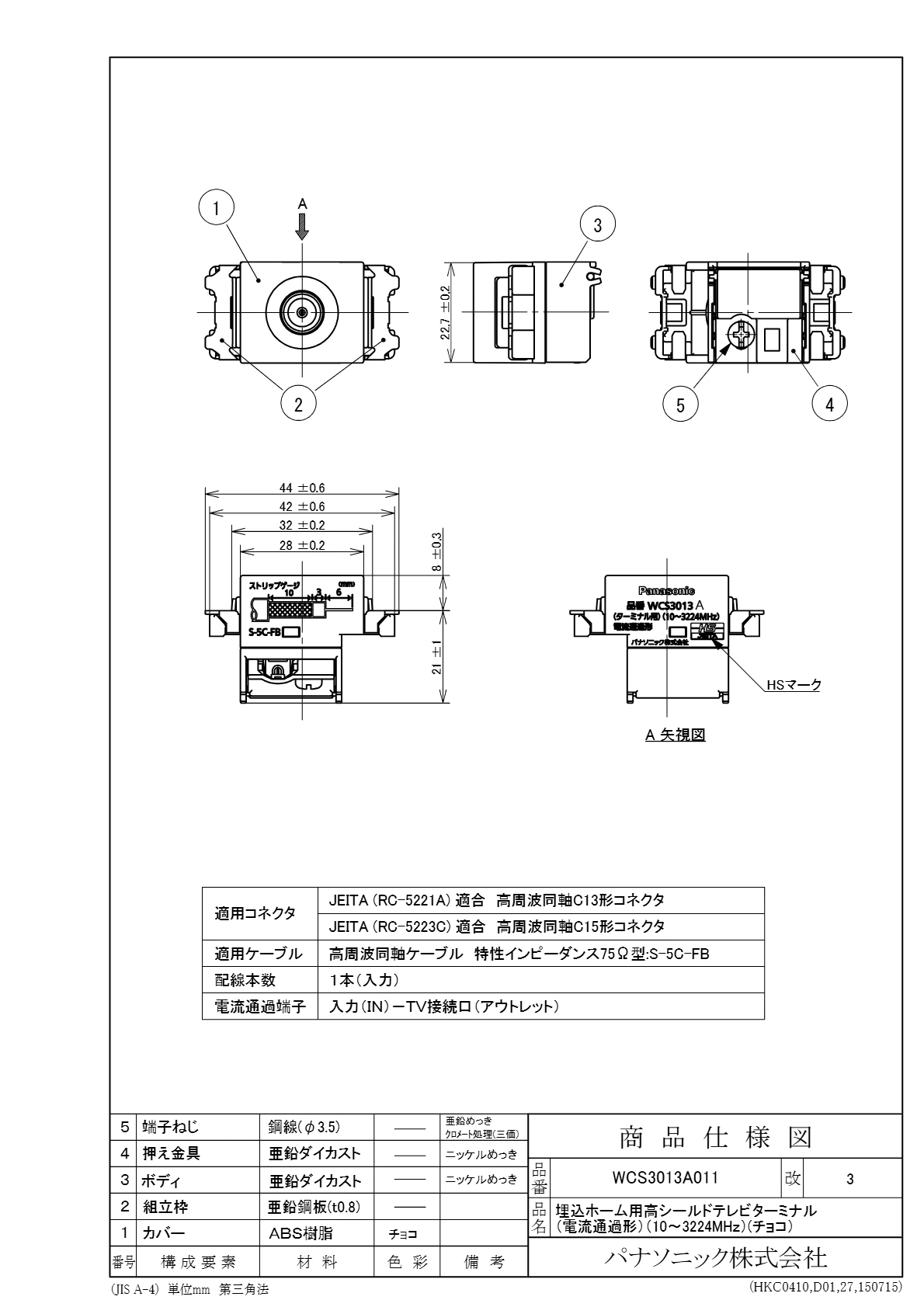 品番:WCS3013A011品名:埋込ホーム用高シールドテレビターミナル(電流通過形)(10~3224MHZ)(チョコ)