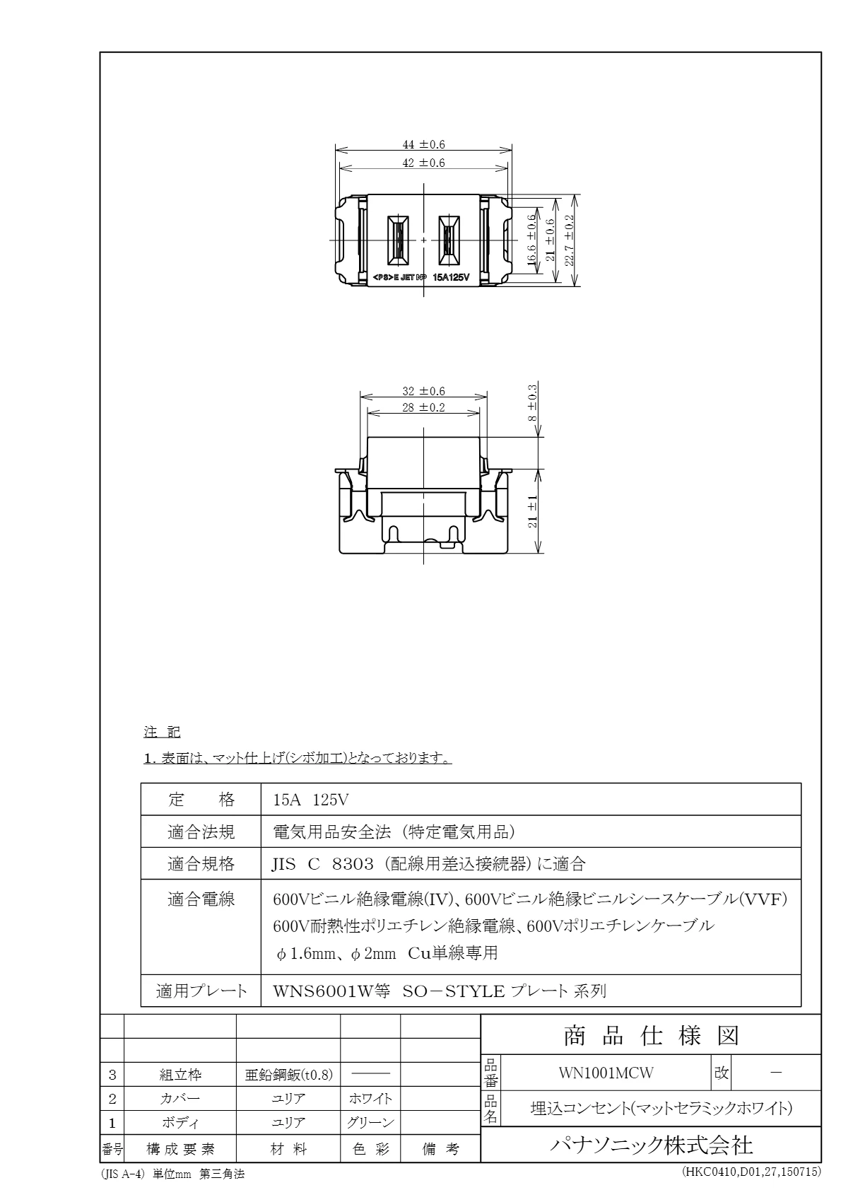 品番:WN1001MCW品名:埋込コンセント(マットセラミックホワイト)