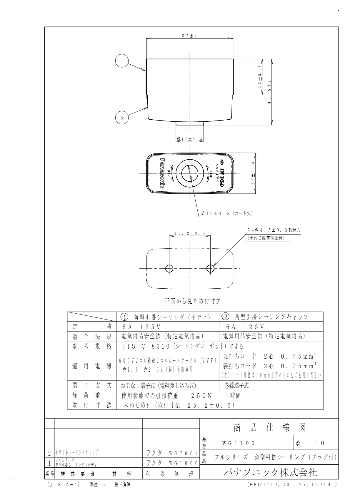 品番:WG1100品名:フルシリーズ角型引掛シーリング(プラグ付)