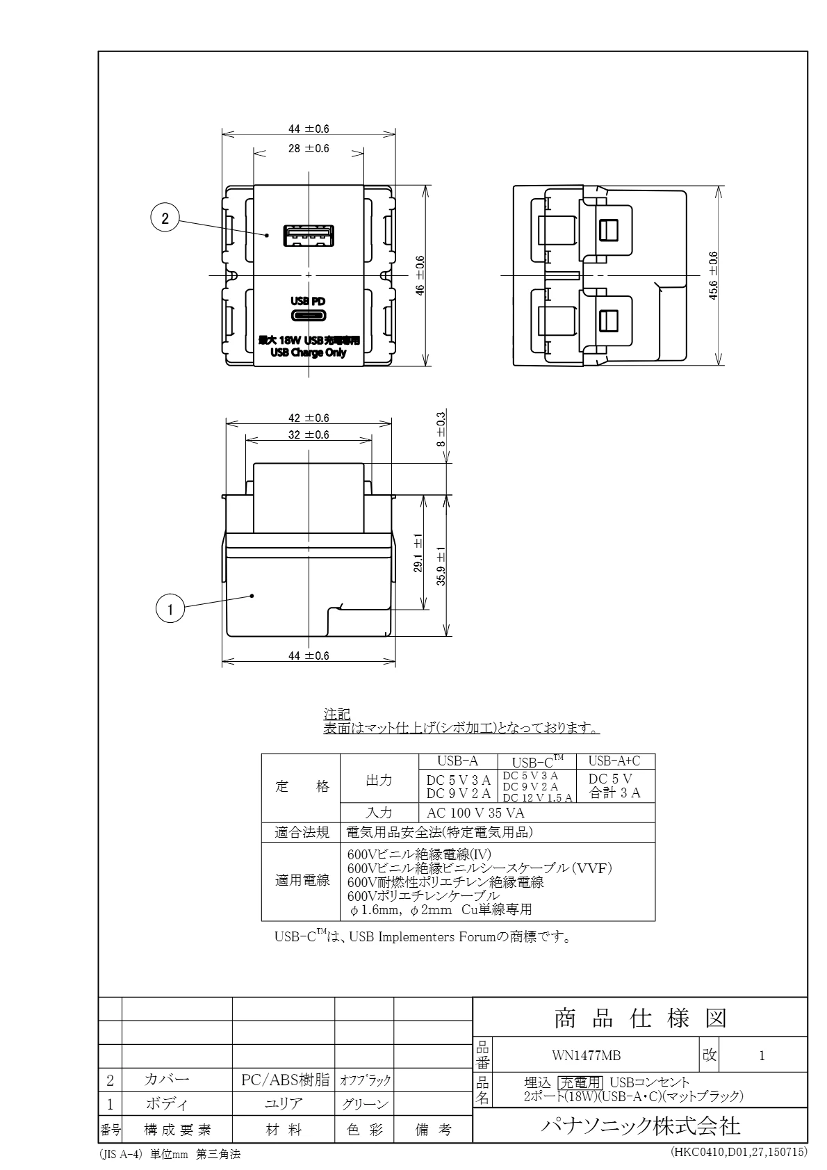 品番:WN1477MB品名:埋込充電用USBコンセント2ポート(18W)(USB-A・C)(マットブラック)