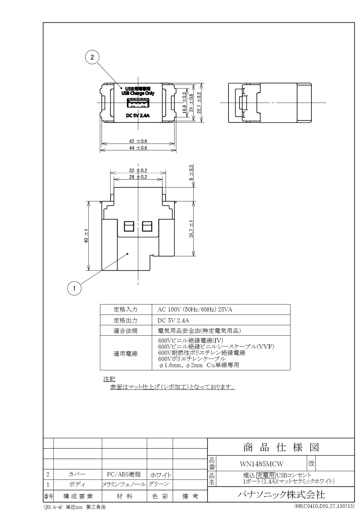 品番:WN1485MCW品名:埋込[充電用]USBコンセント1ポート(2.4A)(マットセラミックホワイト)