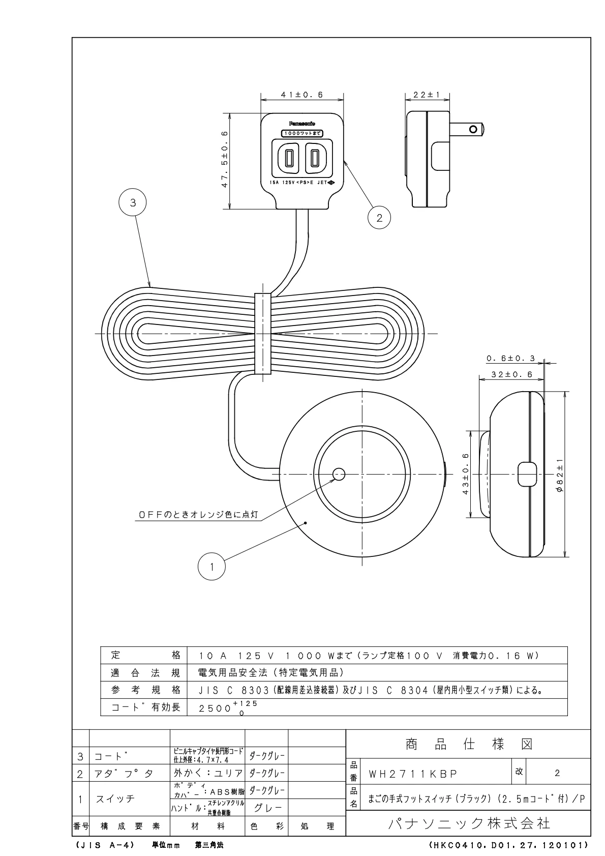 WH2711KBP まごの手式フットスイッチ(ブラック)(2.5Mコード付)10A125V/プラスチック個装