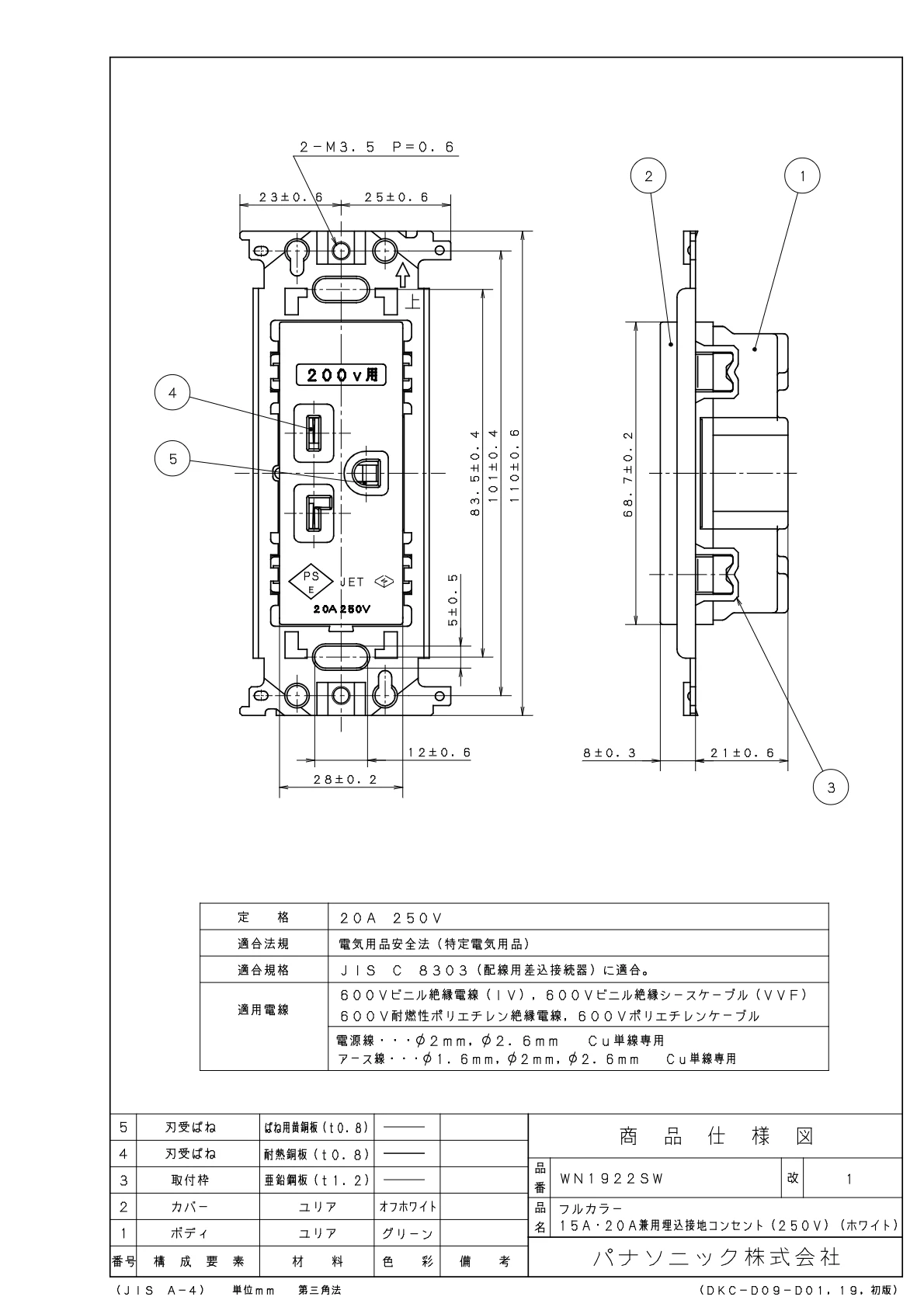 品番:WN1922SW品名:フルカラー15A・20A兼用埋込接地コンセント(250V)(ホワイト)フルカラー15A・20A兼用