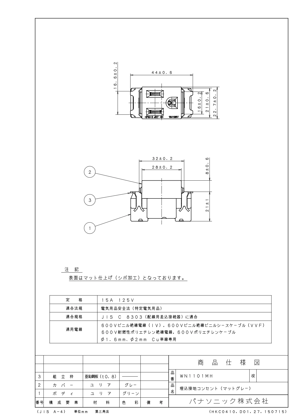 品番:WN1101MH品名:埋込接地コンセント(マットグレー)