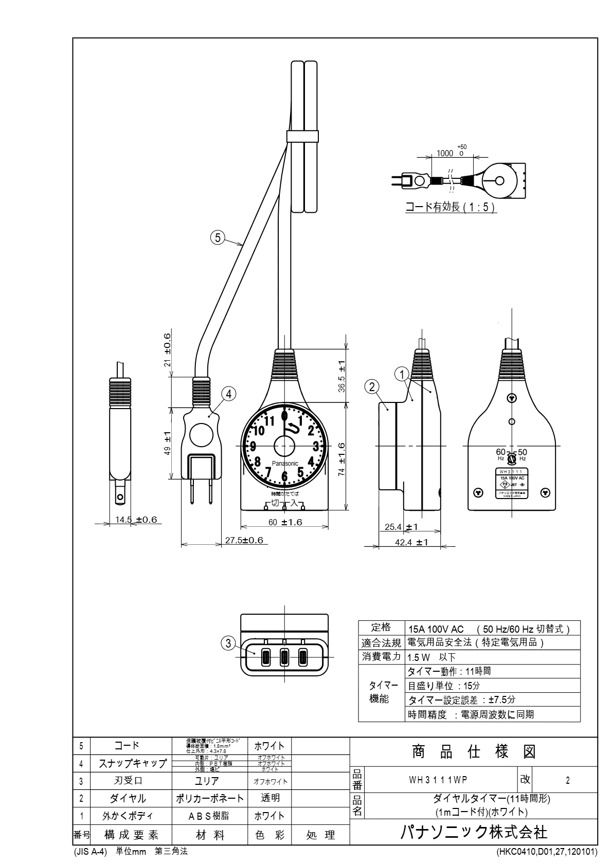 品番:WH3111WP品名:ダイヤルタイマー(11時間形)(1Mコード付)(ホワイト)