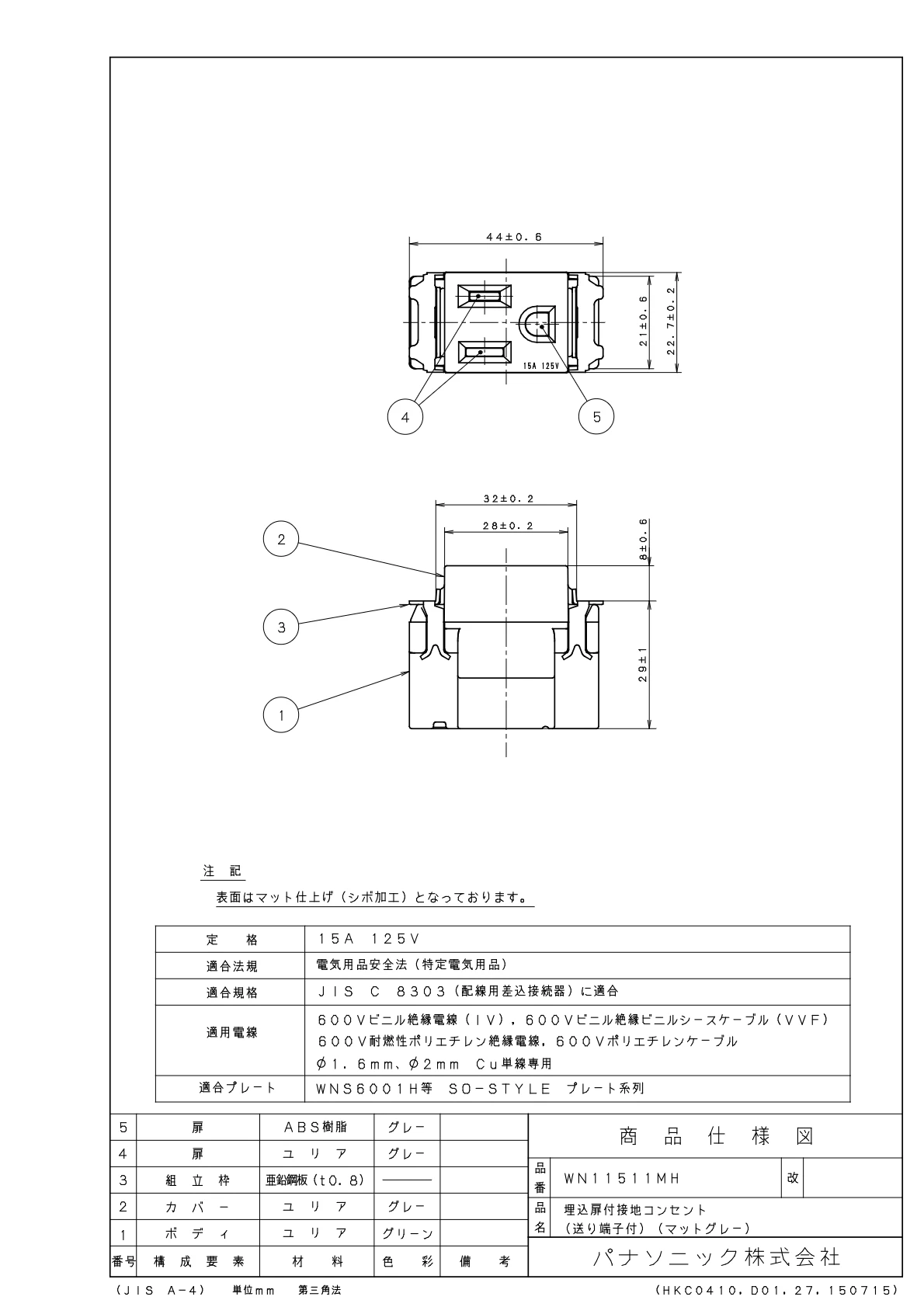 品番:WN11511MH品名:埋込扉付接地コンセント(送り端子付)(マットグレー)