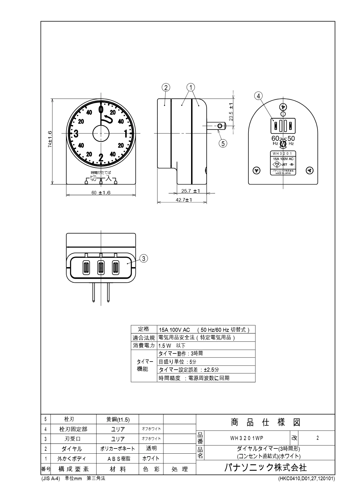 品番:WH3201WP品名:ダイヤルタイマー(3時間形)(コンセント直結式)(ホワイト)