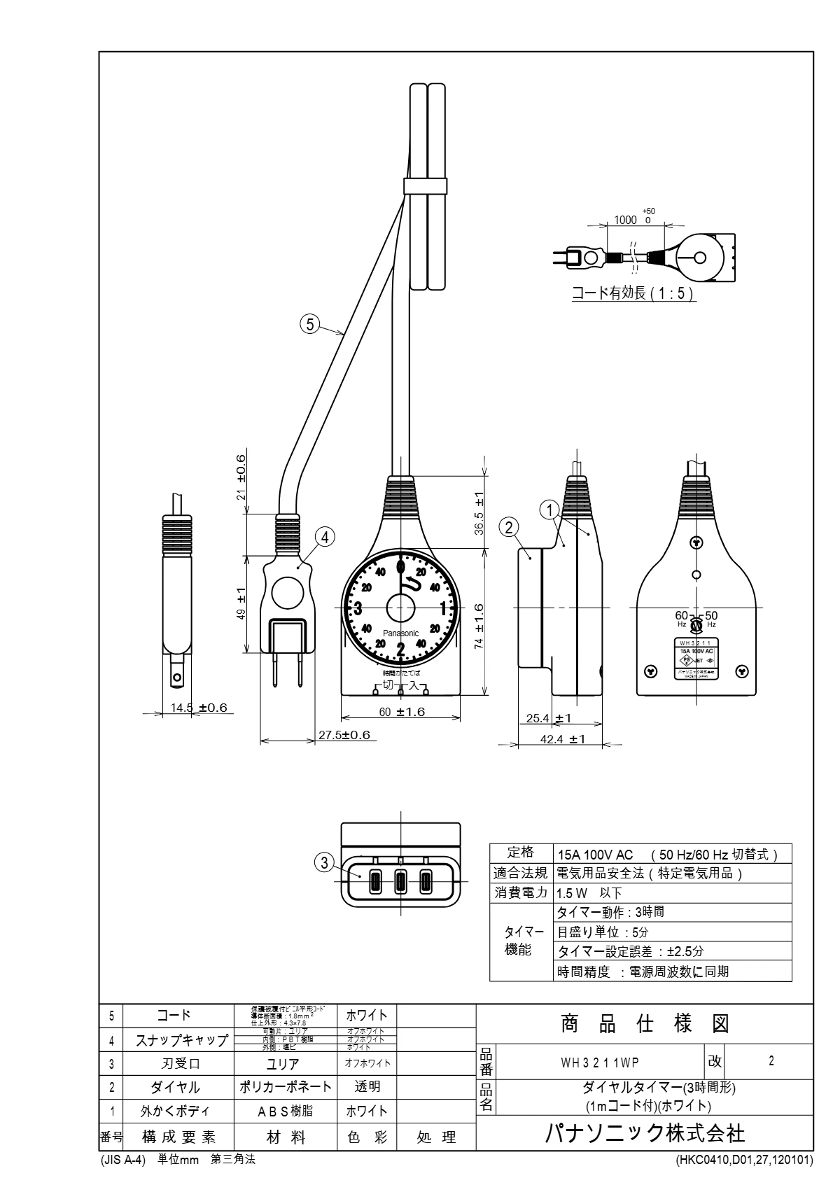 品番:WH3211WP品名:ダイヤルタイマー(3時間形)(1Mコード付)(ホワイト)