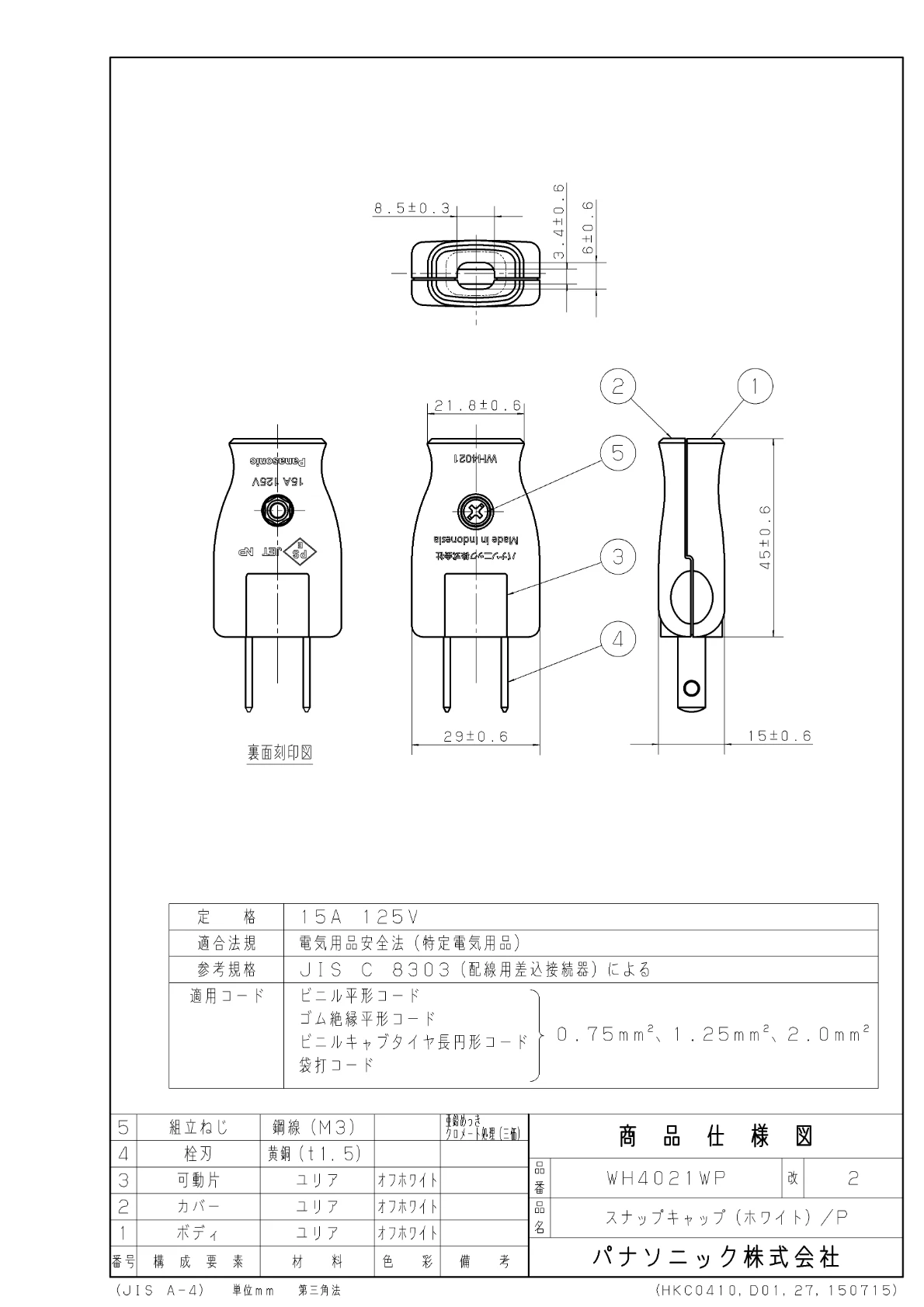 WH4021WP スナップキャップ(ホワイト)/プラスチック個装