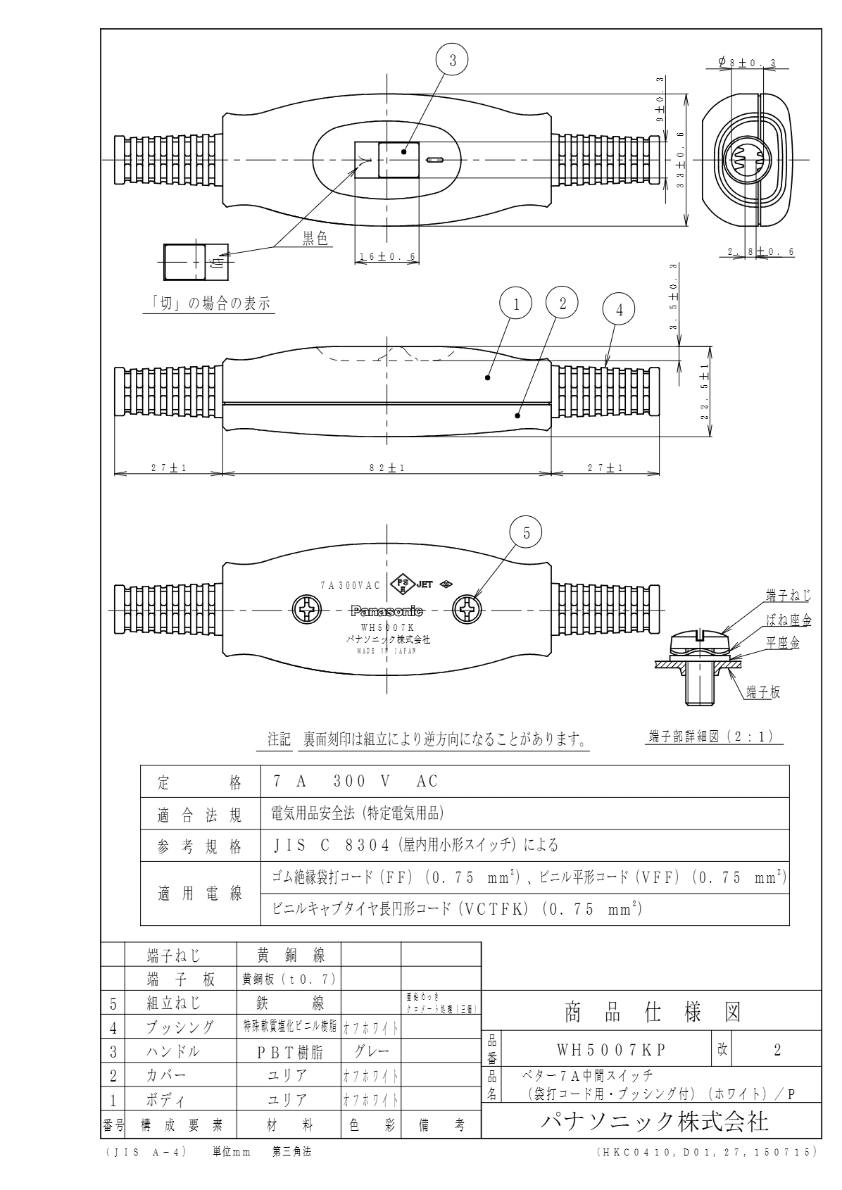 WH5007KP ベター7A中間スイッチ(袋打コード用・ブッシング付)(ホワイト)/プラスチック個装