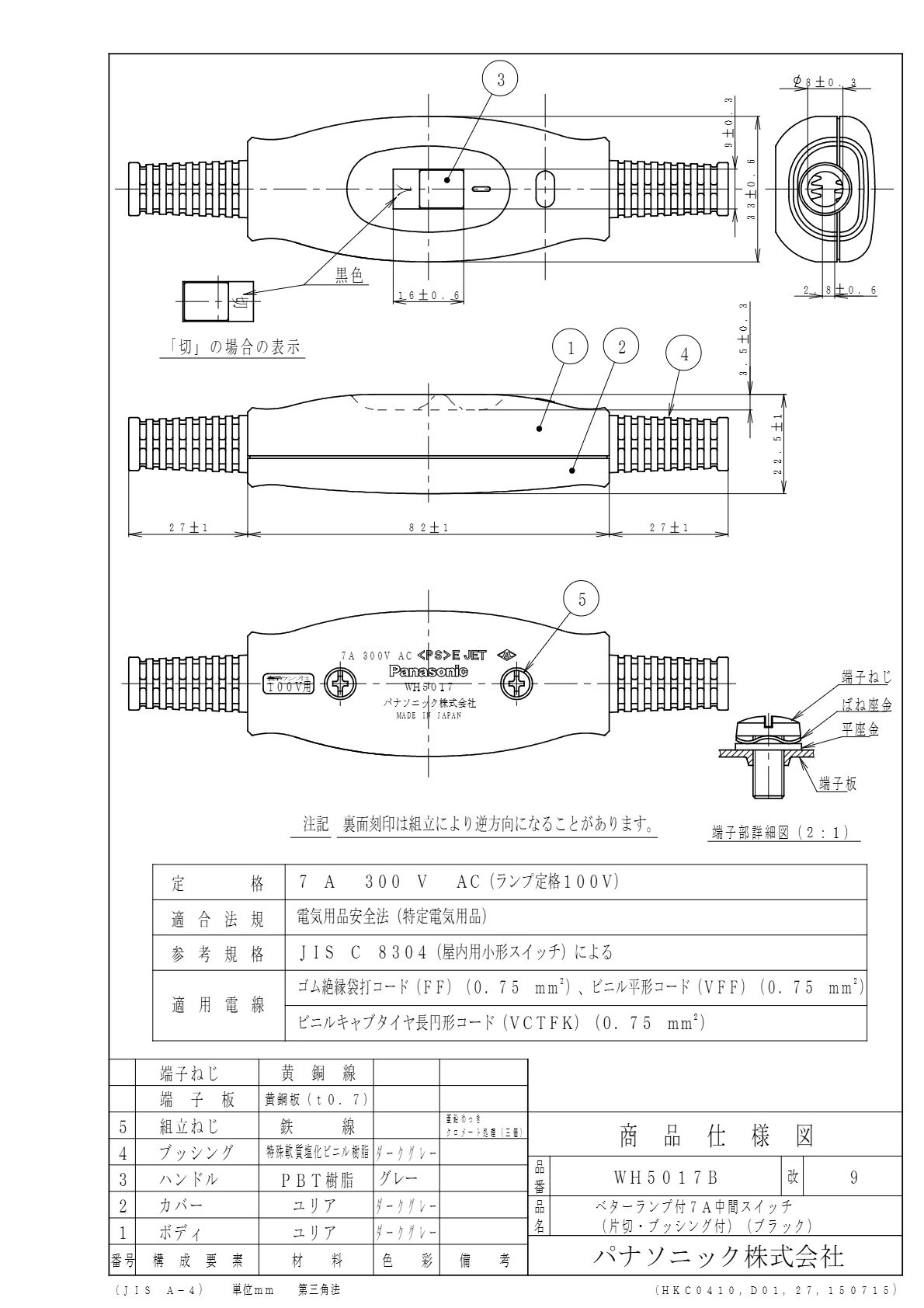 品番:WH5017B品名:ベターランプ付7A中間スイッチ(片切・ブラック)