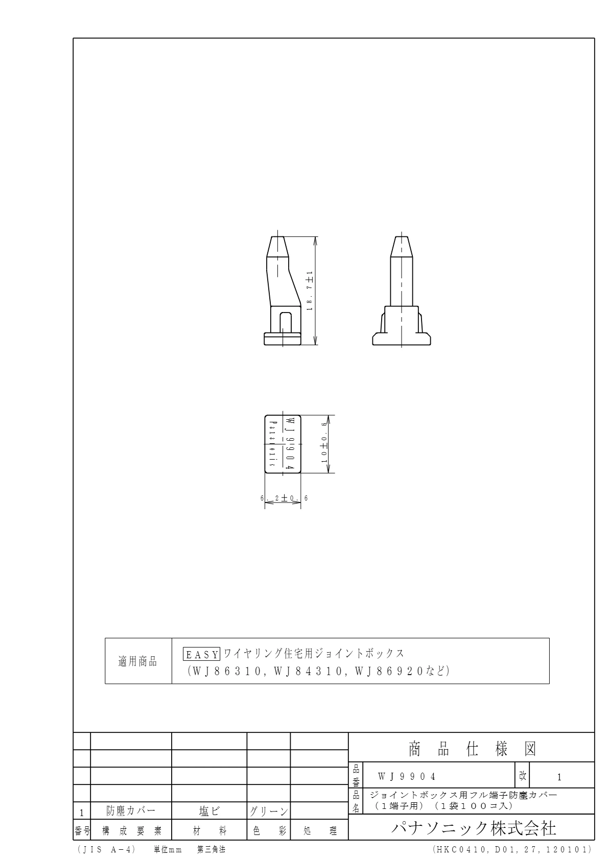 品番:WJ9904品名:ジョイントボックス用フル端子防塵カバー(1端子用)(1袋100コ入)