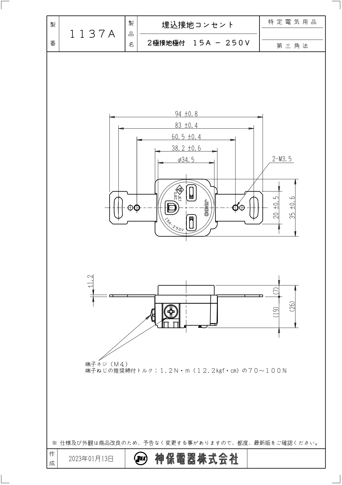 1137A-C 埋込接地コンセント 2極接地極付 15A-250V チョコ