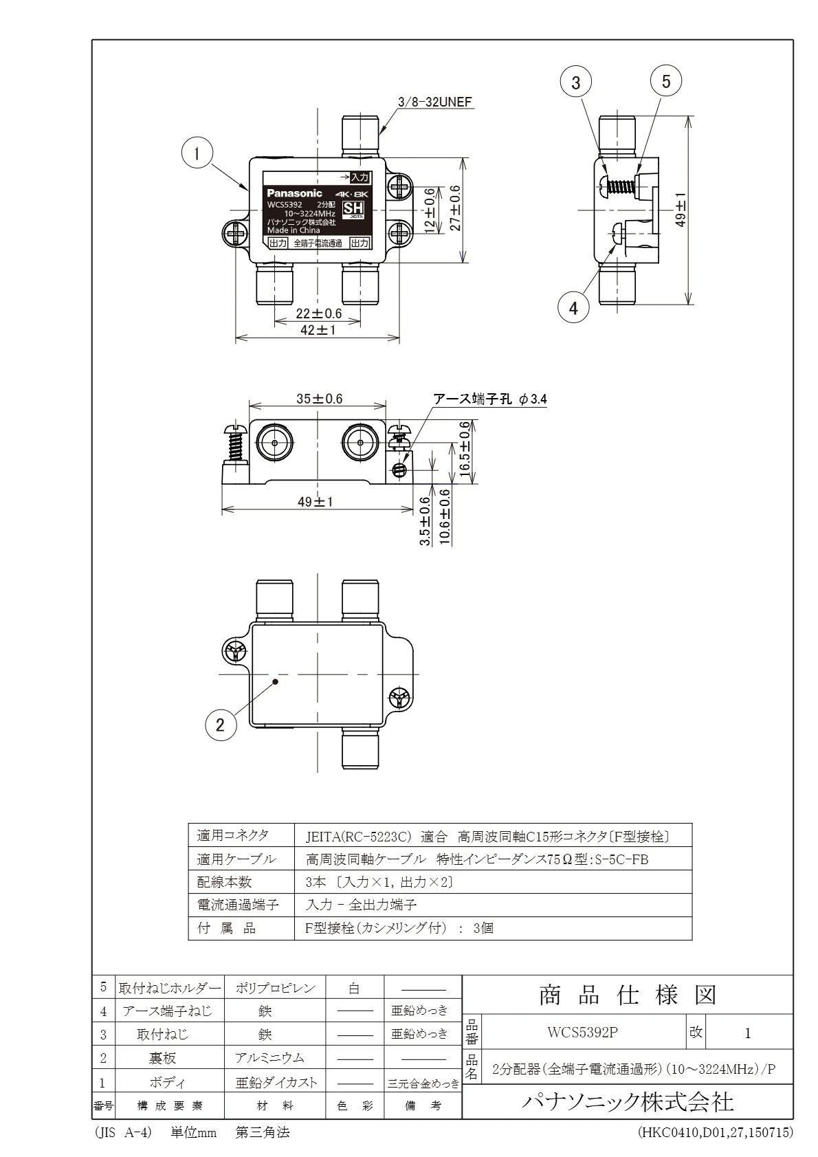 品番:WCS5392P品名:2分配器(全端子電流通過形)(10~3224MHZ)/プラスチック個装