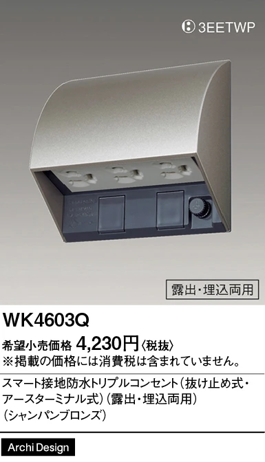 品番:WK4603Q品名:スマート接地防水トリプルコンセント(抜け止め式・アースターミナル式)(露出・埋込両用)(シャンパンブロンズ)