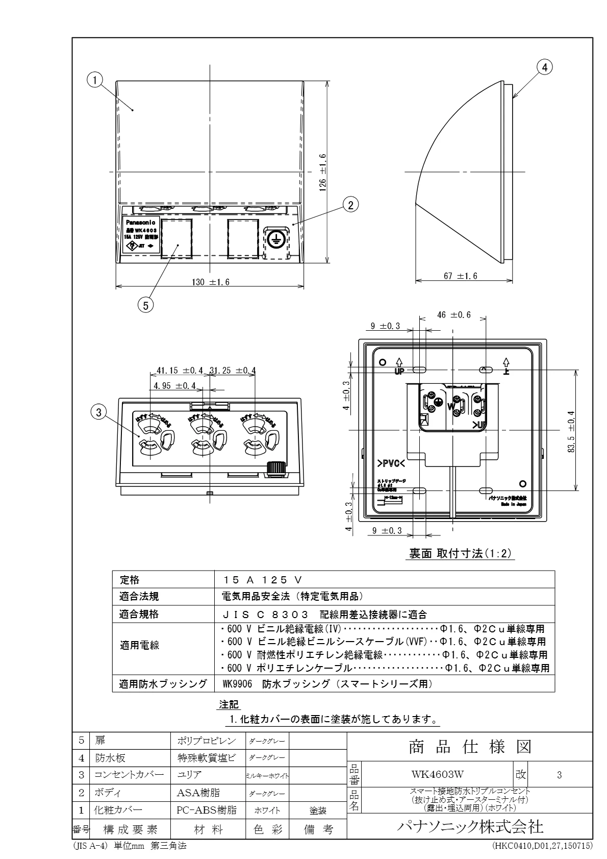 品番:WK4603W品名:スマート接地防水トリプルコンセント(抜け止め式・アースターミナル式)(露出・埋込両用)(ホワイト)