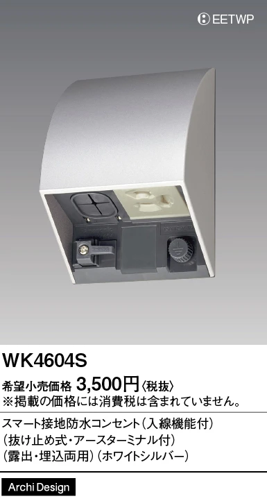 品番:WK4604S品名:スマート接地防水コンセント(入線機能付)(抜け止め式・アースターミナル付)(露出・埋込両用)(ホワイトシルバー)